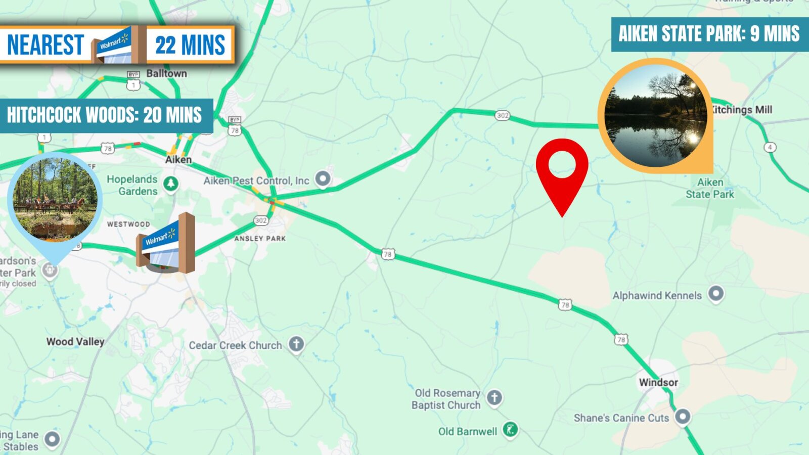 NEARBY – Aiken State Park (7 mins), Virginia Acres Park (18 mins), Generations Park (21 mins), Henderson Heritage Preserve (23 mins), Hounds Lake (24 mins), Richardsons Lake (25 mins), Hitchcock Woods (26 mins), Langley Pond (31 mins), Augusta Riverwalk (44 mins), and more!