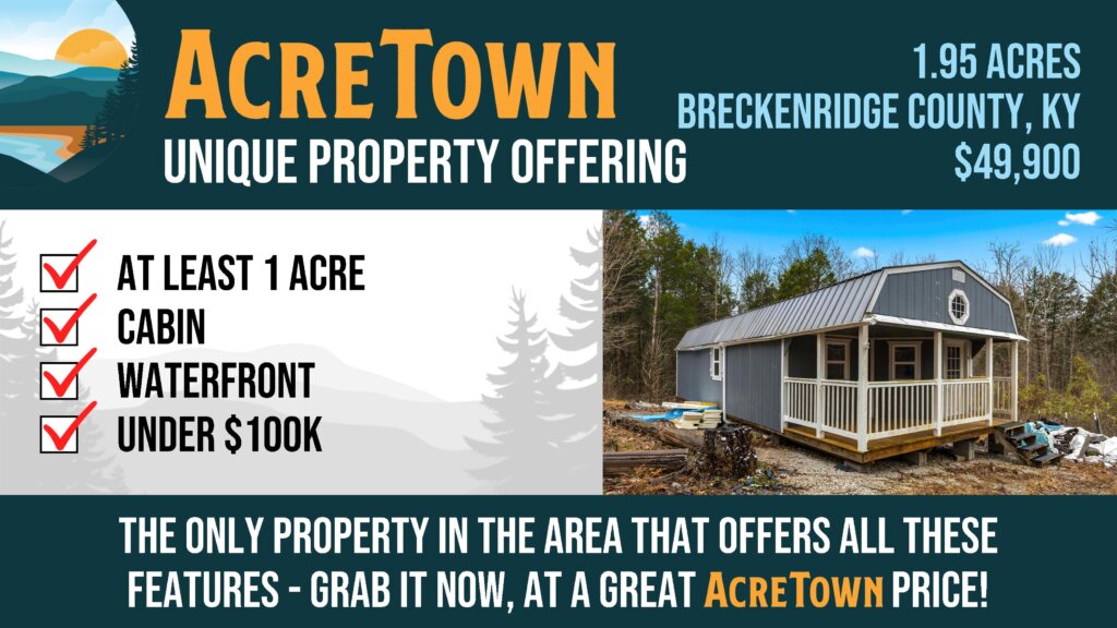Farm Credit Mid America is one of the best local land lenders in the area for rural properties and they require as little as 10% down up to a 30-year term, with interest rates as low as 7.55%, with no pre-payoff penalties. Please contact them by phone at (270) 756-5268 or visit their nearest office for more information: 1063 S Hwy 259, Hardinsburg, KY 40143.