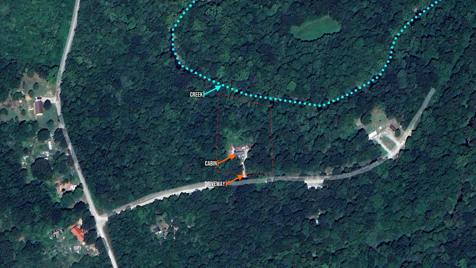 - ELEVATION: 578 feet at cabin, 545 feet at creek