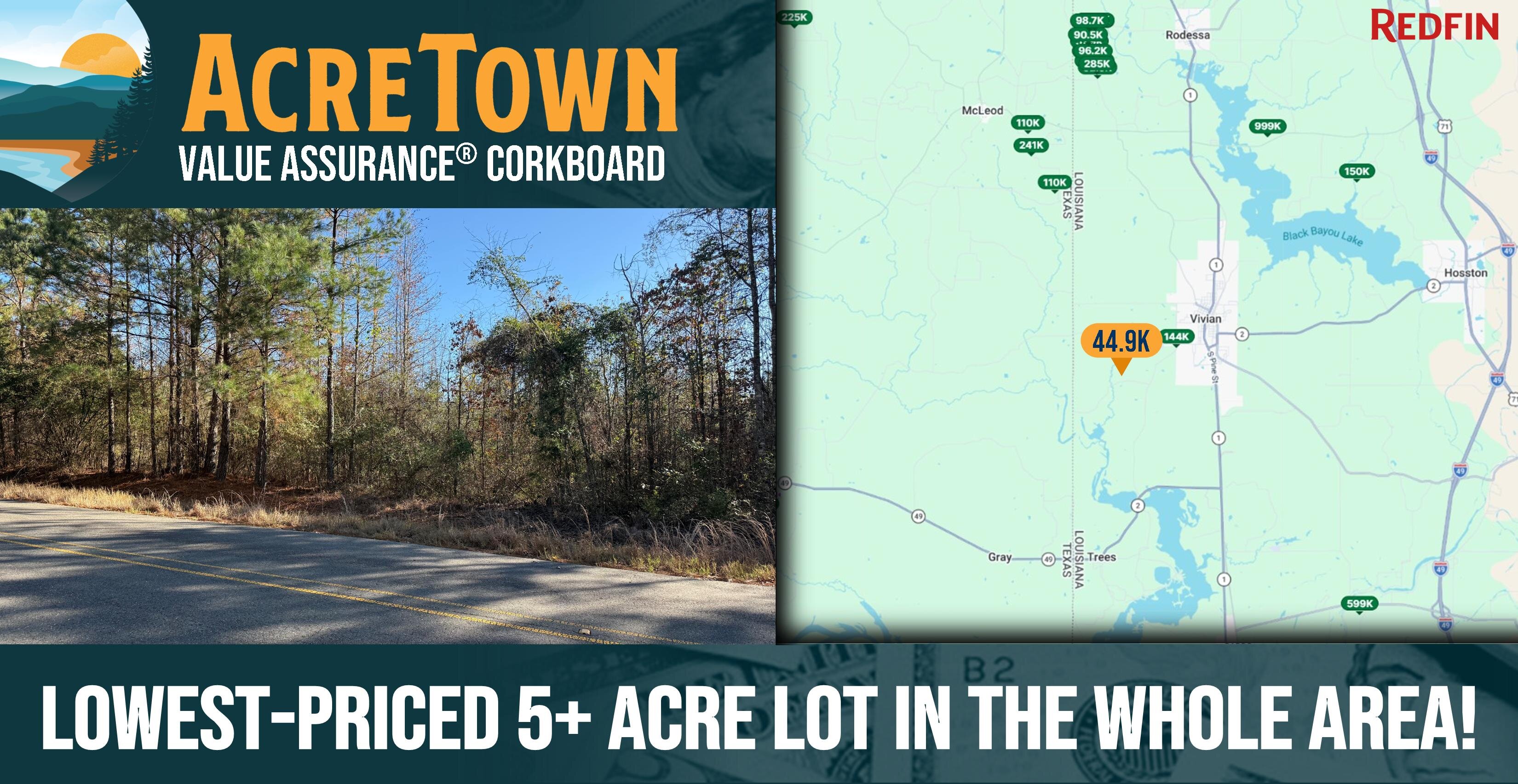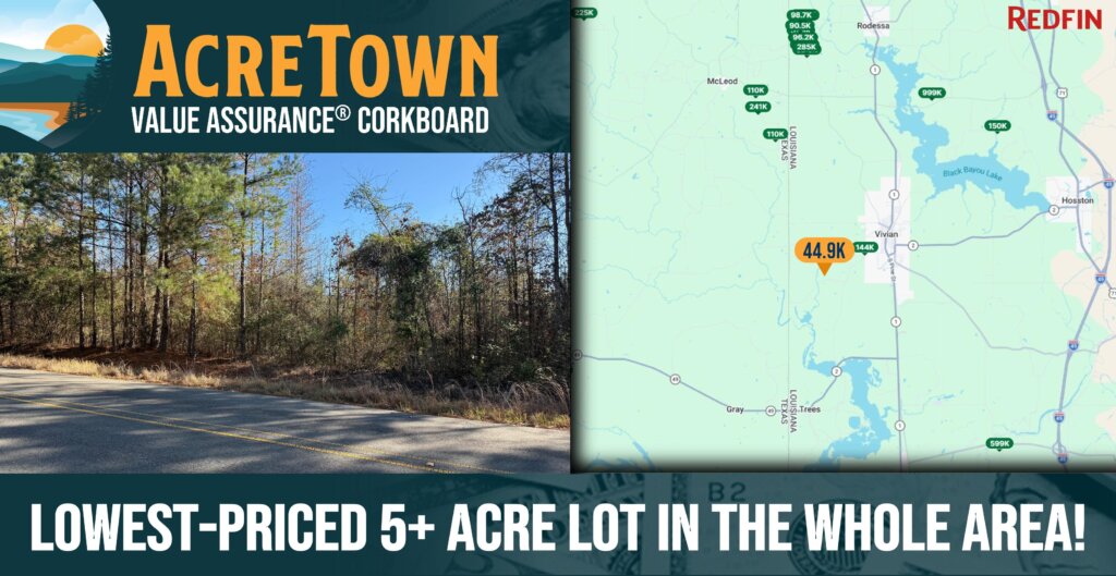 SE LOT: Access is simple and private thanks to 439 of paved public road frontage along Monterey Road, which is lined with power. The land itself is exceptionally usable—very flat, dry, and highly buildable, with no floodplain or wetlands to complicate your plans. A new survey has recently been completed, so boundaries are clearly marked and ready for your vision, which – thanks to extremely flexible Agricultural zoning and no deed restrictions – can include just about any type of development, including mobile homes. Enjoy peaceful rural surroundings while still being just 6 minutes from Vivian and local shopping, making daily errands quick and easy. Best of all, this property is priced well below market, and owner financing is available for ease of ownership, making it simple to secure your own piece of prime Louisiana land. Opportunities like this – unrestricted acreage with power, privacy, convenience, and paved access – don’t last long. We created four lots here – one went under contract before it even hit the market and the other two lasted only 3 days and 6 days on the market before going under contract, so time is critical. Grab it today at an unbeatable Acretown price!