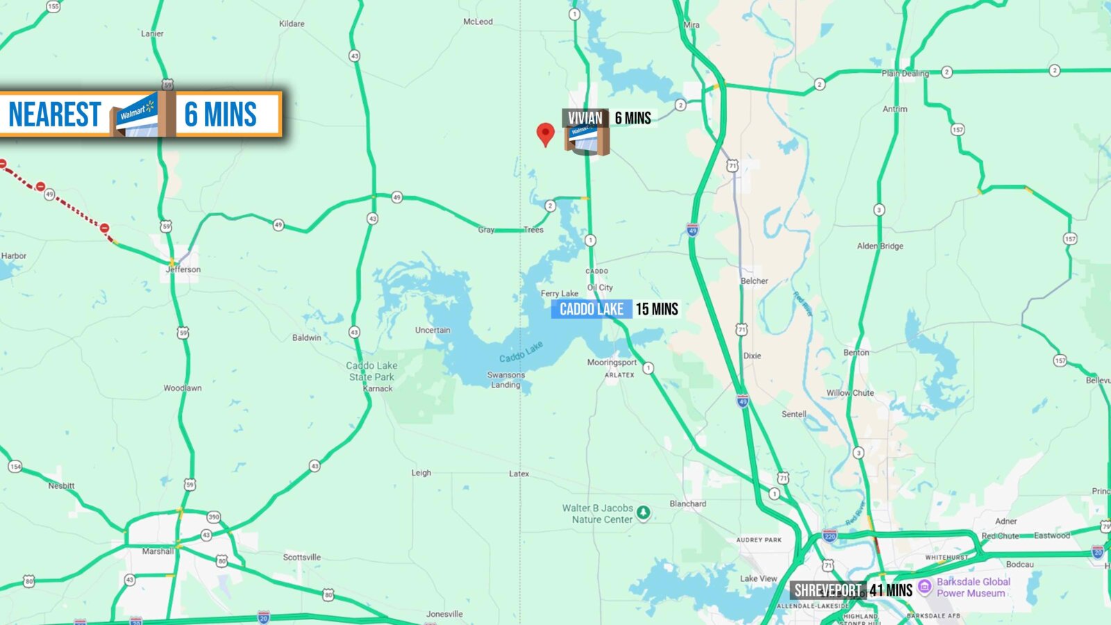- NEAREST AIRPORTS: Vivian Airport (3 mins), Shreveport Regional (43 mins), Dallas-Fort Worth International (3 hrs 30 mins),
