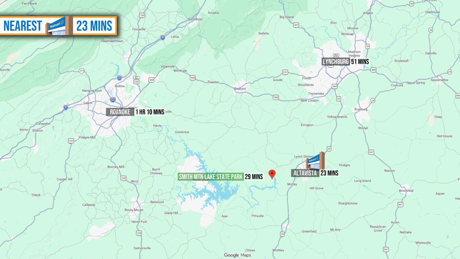 - NEAREST AIRPORTS: Lynchburg Regional (44 mins), Roanoke-Blacksburg Regional (1 hr 16 mins), Richmond International (3 hours)