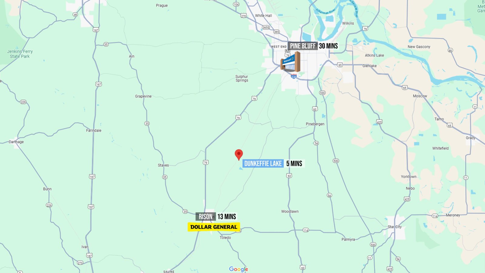 NEARBY – Dunkeffie Lake (5 mins), Bayou Bartholomew River Trail (25 mins), Byrd Lake Natural Area (26 mins), Arkansas Railroad Museum (31 mins), Lake Saracen (32 mins), Pine Bluff Regional Park (33 mins), Cane Creek State Park (40 mins), Jenkins Ferry Battleground State Park (49 mins), Tar Camp Park (52 mins), and more!