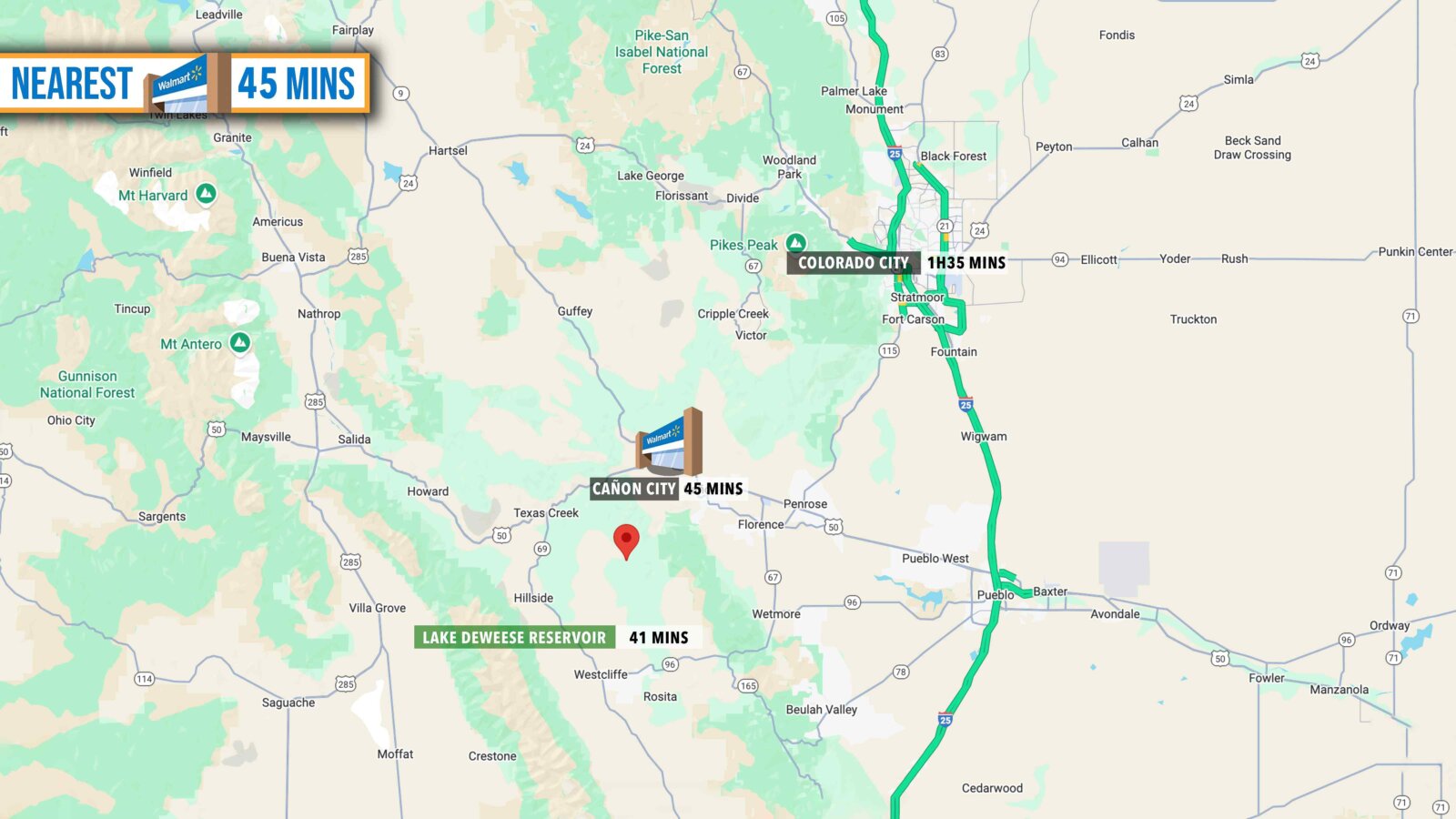 This property is surrounded by classic Colorado recreation, with several standout outdoor destinations close by. First and foremost, the iconic Royal Gorge Bridge & Park, 39 minutes northeast, delivers dramatic canyon views, scenic walking paths, and one of the most breathtaking suspension bridges in the country, making it a go-to destination for sightseeing and outdoor adventure. Nearby Lake DeWeese adds another recreational option, popular for fishing, paddle boating, and quiet shoreline camping with mountain backdrops. For everyday needs, the nearest town for groceries is Westcliff, with major shopping and dining, including a Walmart, in Cañon City. For big city amenities, Colorado Springs is the nearest major metro area, offering extensive shopping, professional services, airports, and major attractions.