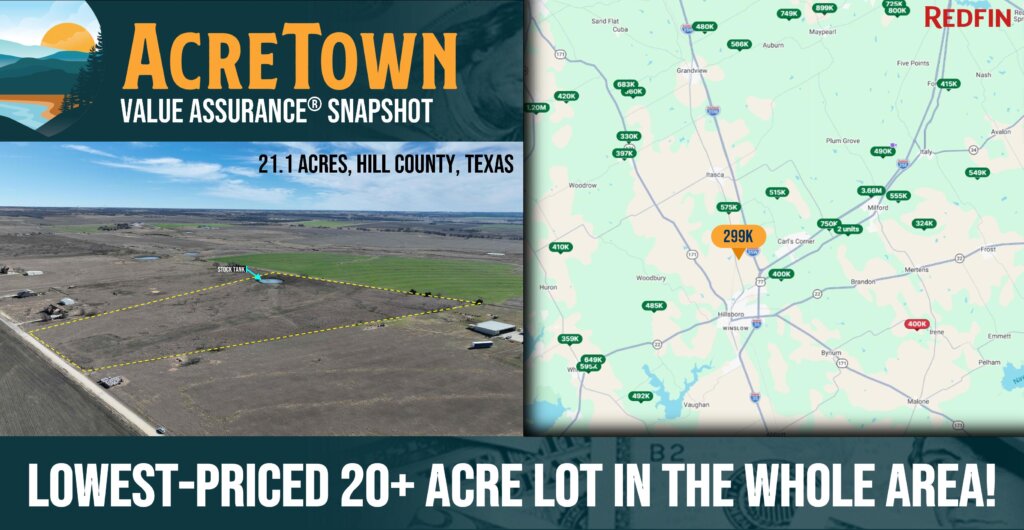Here’s your chance to own a classic Texas ranch property with the space, access, and freedom you’ve been looking for—21.13 acres in Hill County, just minutes from Hillsboro and everyday conveniences, yet close to some of the best recreation Central Texas has to offer. The land is gated and fenced, offering immediate privacy and security, and features a half-acre stock tank that adds both charm and function—perfect for livestock, wildlife, or peaceful evenings by the water. With power and water available along the road frontage and 341 feet of public road access, getting set up is straightforward and convenient. This property truly shines when it comes to buildability. The terrain is flat, clear, and completely outside the floodplain, making it ideal for a custom home, barndominium, or weekend retreat. Whether you’re planning to build now or hold for the future, this land gives you options without complications. Location is another major advantage. You’re just 7 minutes from Hillsboro and Walmart for daily needs, and only 25 minutes from Lake Whitney State Park, often called the Getaway Capital of Texas, where boating, fishing, hiking, and camping await. Best of all, this ranch is priced well below market, and owner financing is available, making it easier than ever to turn your land ownership goals into reality. If you’ve been waiting for a well-located, build-ready Texas ranch with water, access, and value—this is the one. Grab it today at an unbeatable Acretown price!