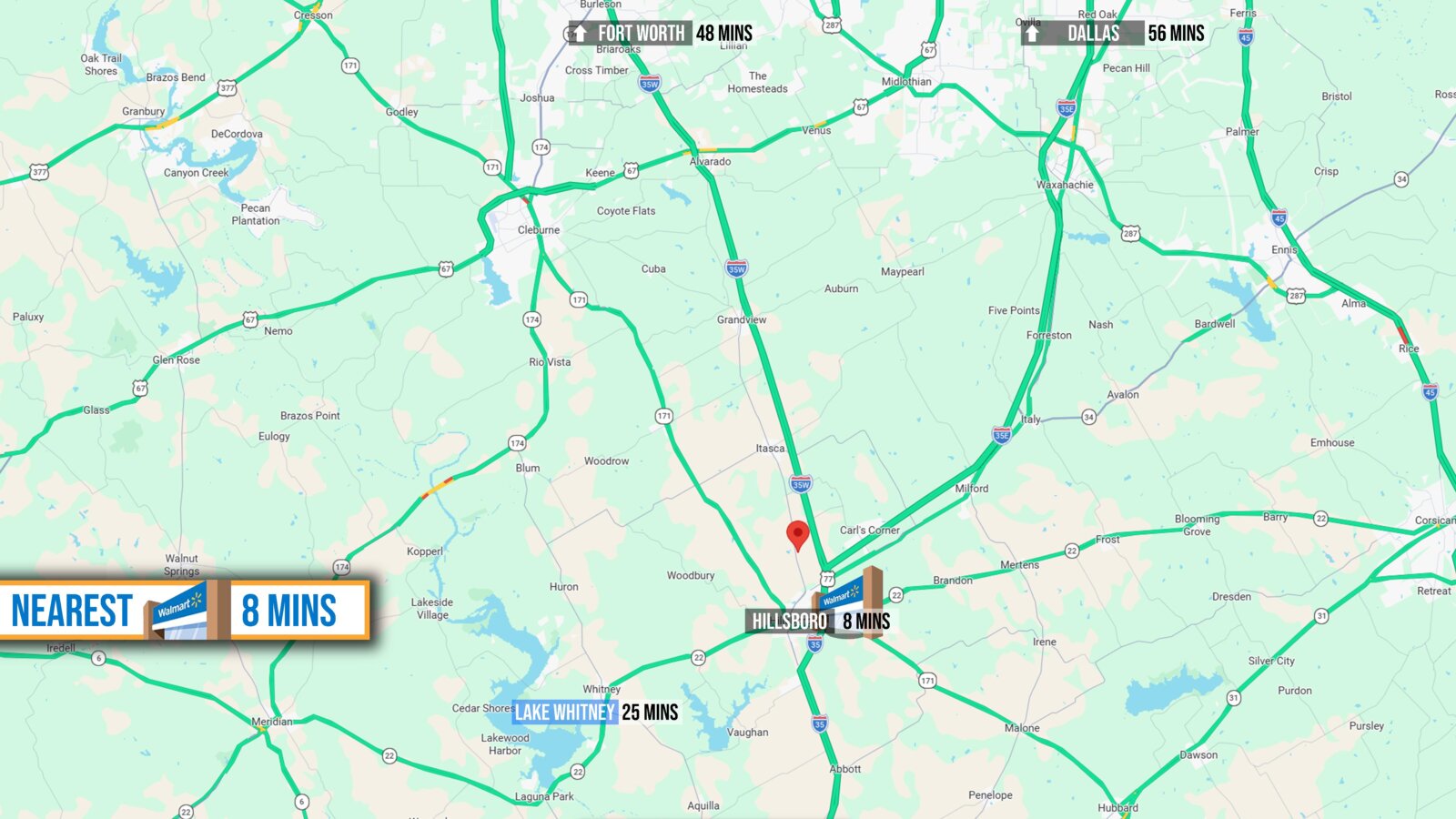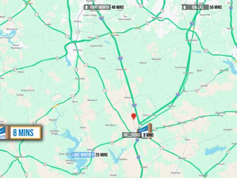 - NEAREST AIRPORTS: Hillsboro Municipal Airport (7 mins), Dallas-Fort Worth International (1 hr 14 mins)