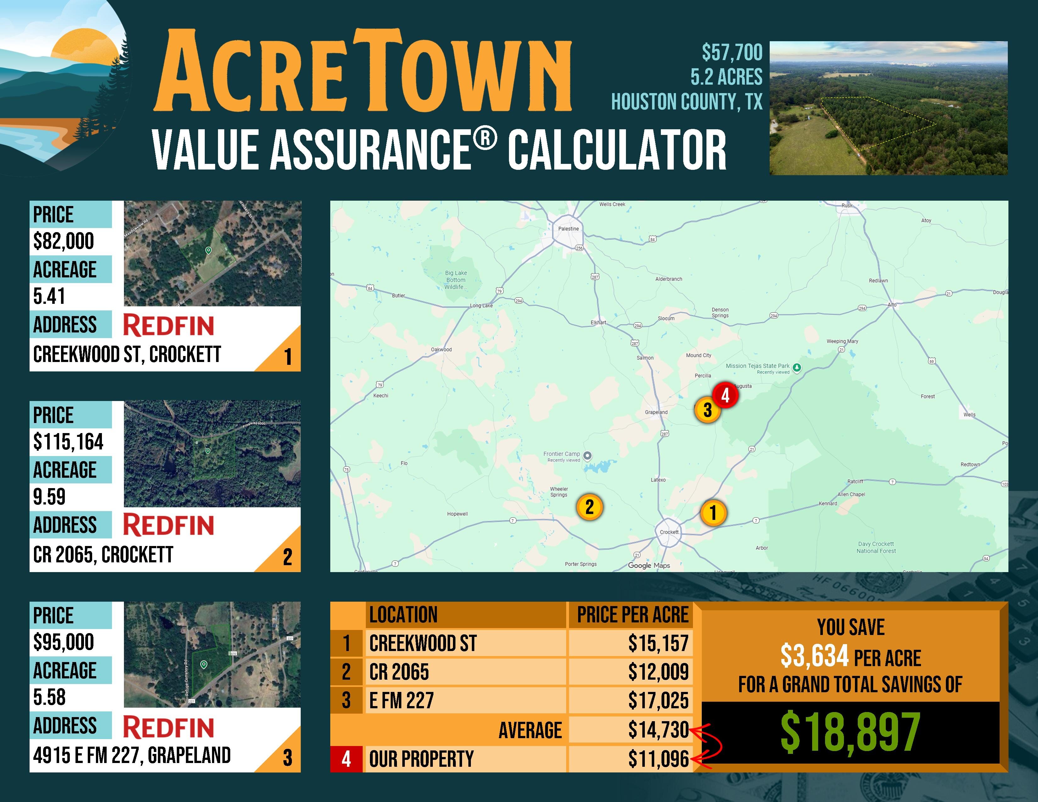 This 5.2 acre property near Grapeland and just 20 minutes from Crockett offers unrestricted Texas countryside living with modern conveniences in place. Mostly wooded with a small clearing, it’s flat, high, and very buildable with no floodplain or wetlands to worry about. The land features a gated entrance, partial fencing, and dual access with 123 feet of county road frontage plus 676 feet along a private easement road. Power is available via an on-site pole and public water runs along the frontage. With no zoning, no deed restrictions, and no HOA, you’re free to build a home, cabin, or mobile, set up an RV, or simply enjoy recreational use surrounded by abundant deer and wildlife. Taxes are low, the neighborhood is peaceful, and the property will comes with a clean title. Located close to Houston County Lake, Mission Tejas State Park, and the Caddo Mounds Historic Site, it’s perfect for residential, recreational, or investment use—all priced well below market value. Grab it today at an unbeatable Acretown price!