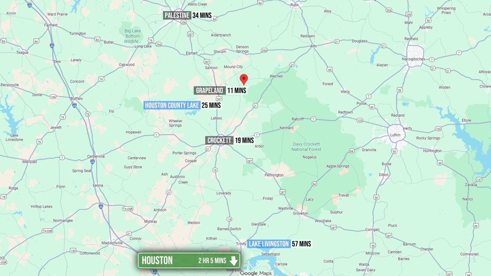 NEARBY – Salmon Lake Park (16 mins), Houston County Lake (25 mins), Mission Tejas State Park (16 mins), Caddo Mounds State Historic Site (19 mins), Lake Mary (26 mins), Ratcliff Recreation Area (28 mins), Houston County Lake (32 mins), Ratcliff Lake (35 mins), Davey Dogwood Park (41 mins), and more!