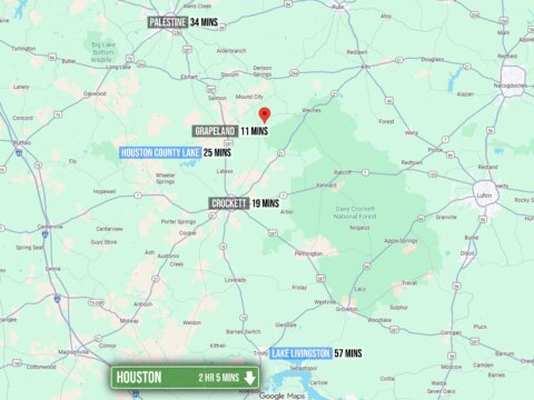 Outdoor enthusiasts will love exploring Houston County Lake, a peaceful getaway known for camping, swimming, and family-friendly festivals throughout the year, while Mission Tejas State Park offers over 8 miles of scenic hiking trails that wind through pine and hardwood forests and even pass historic log structures. For a step back in time, the Caddo Mounds State Historic Site showcases the preserved earth mounds of the ancient Caddo people and features an engaging museum and cultural programs. For day-to-day needs, run into Grapeland or if you need a Walmart or other big box shopping, Crockett is just 10 minutes farther south. The nearest major city is Houston just over two hours away, offering world class retail, dining, and cultural experiences.