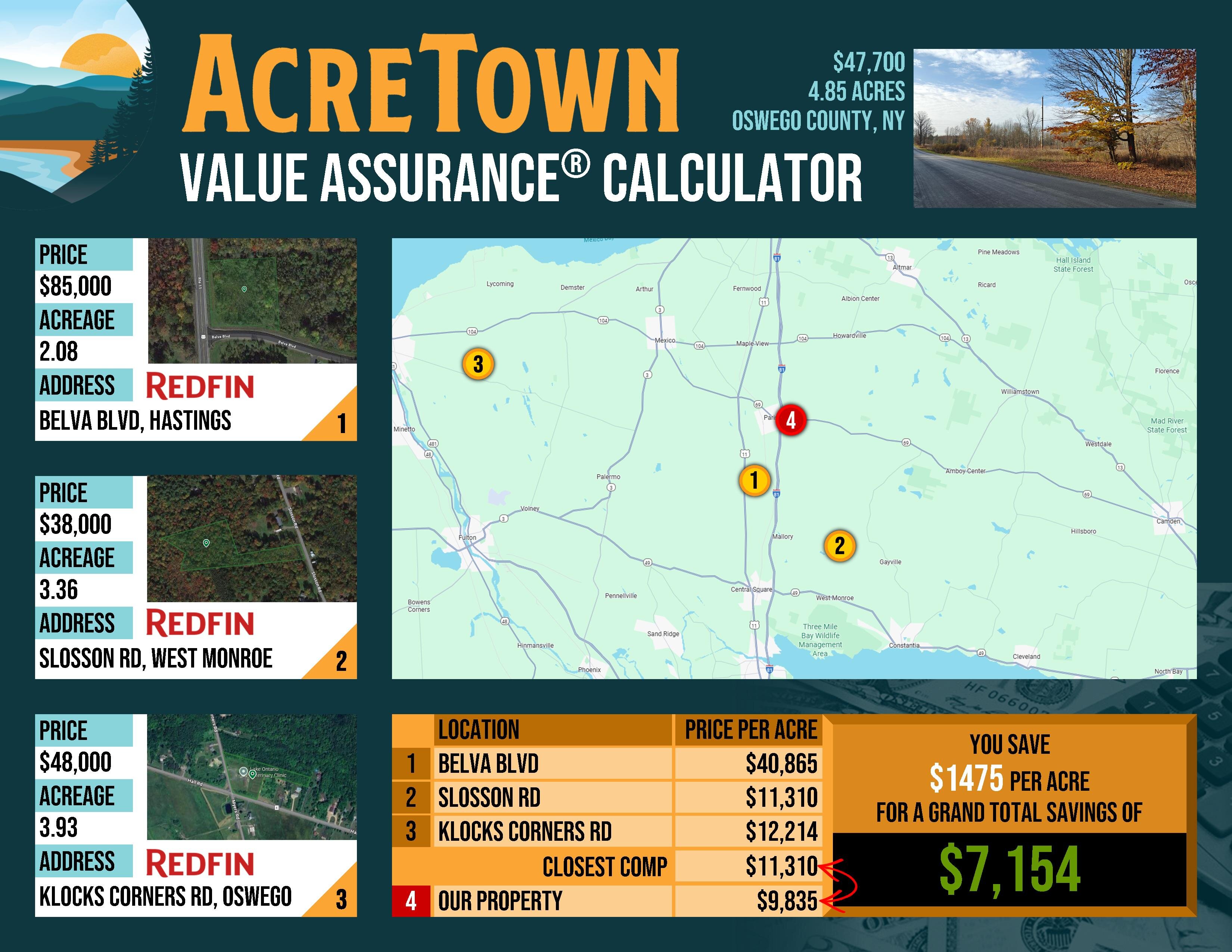 Welcome to Stonewall Farm! This new and peaceful 4.85 acre property near Parish, in upstate New York, lies just minutes from Lake Ontario’s endless recreational opportunities. This flat, perc-approved lot is partially cleared yet mostly wooded, offering both privacy and natural beauty, with a small wetlands feature around the back southern boundary that attracts abundant deer and wildlife. With 324 feet of paved public road frontage on White Road and an electric pole already on-site, access and power are simple, while a well and septic can be installed to suit your build. Free from HOAs and restrictive covenants, this property is zoned Rural/Mixed Use—perfectly flexible for residential or recreational living, with mobile/manufactured homes and even some commercial uses allowed. Recently surveyed and free of any floodplain encroachments, it’s very buildable and surrounded by a safe, quiet neighborhood. Just 3 minutes from town and within 20 minutes of multiple lakes, waterfalls, state forests, and wildlife areas, this charming location makes for an ideal countryside estate. Owner financing is available too, so grab it today at an unbeatable Acretown price!