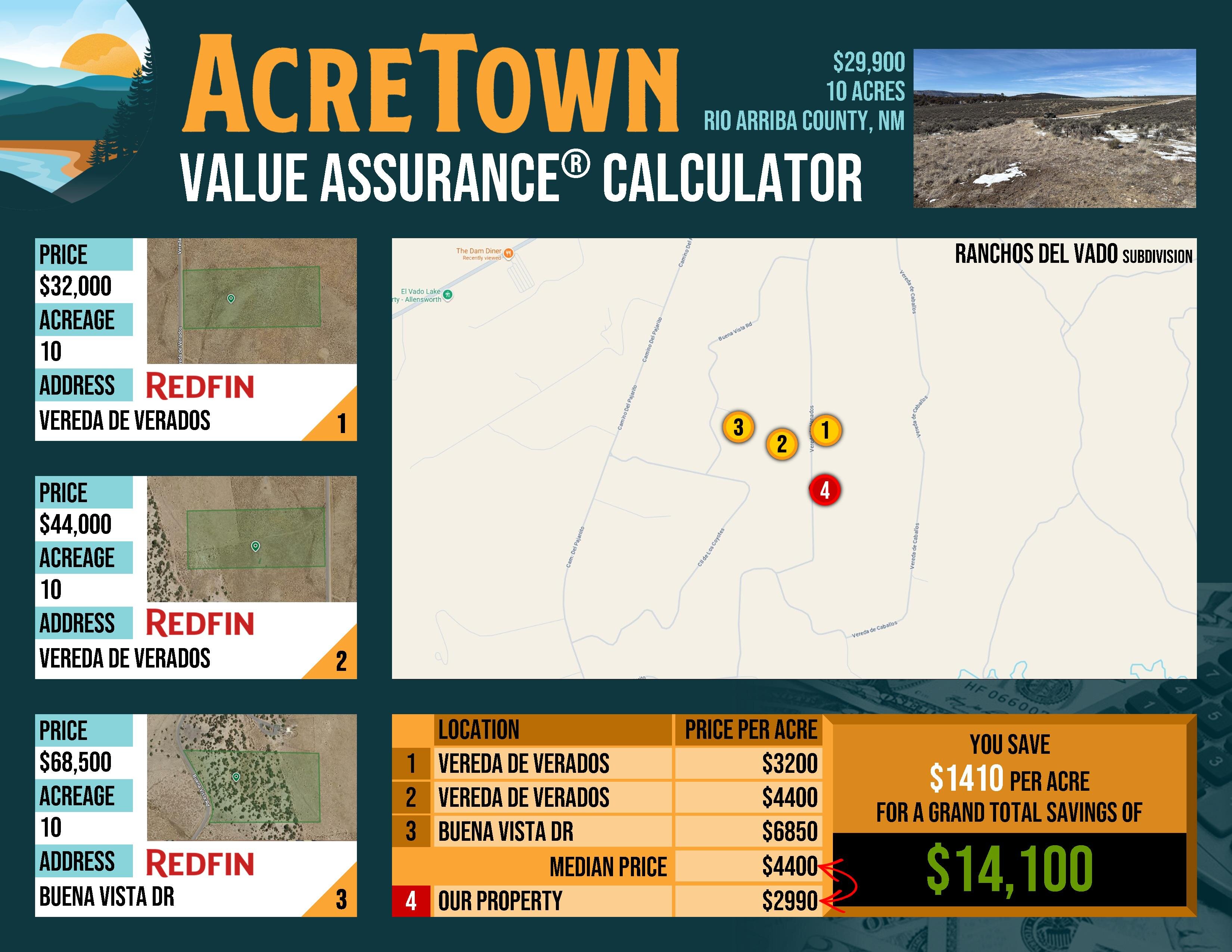 This 10 acre parcel in the El Vado Lake subdivision offers a flat, highly buildable homesite with a graded driveway, cleared pad, light brush, and some newly planted juniper and ponderosa pines, making it perfect for residential or recreational use, including mobile homes and RVs. The property features approximately 436 feet of frontage on Vereda de Venados, a private road, with no floodplain, generally level topography, and two minor arroyo channels well away from the main build area. Utilities are off-grid, ideal for solar power, with well and septic needed, though community potable water and bathrooms are available nearby. The neighborhood is gate-protected with light deed restrictions (mobile homes allowed) and no zoning. Enjoy peaceful, safe surroundings, cheap annual taxes of just $316, abundant deer & wildlife, and quick access to El Vado Lake State Park, Heron Lake State Park, and surrounding public lands for fishing, boating, hiking, and outdoor adventure—all while being one of the lowest-priced 10+ acre properties on the market in this desirable high-desert lake region. Grab it today at an unbeatable Acretown price!