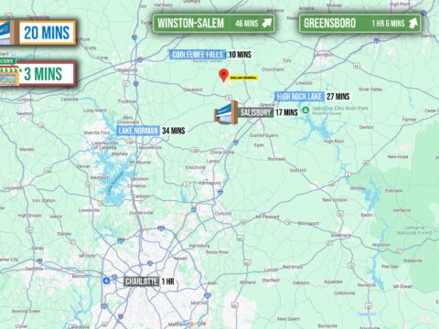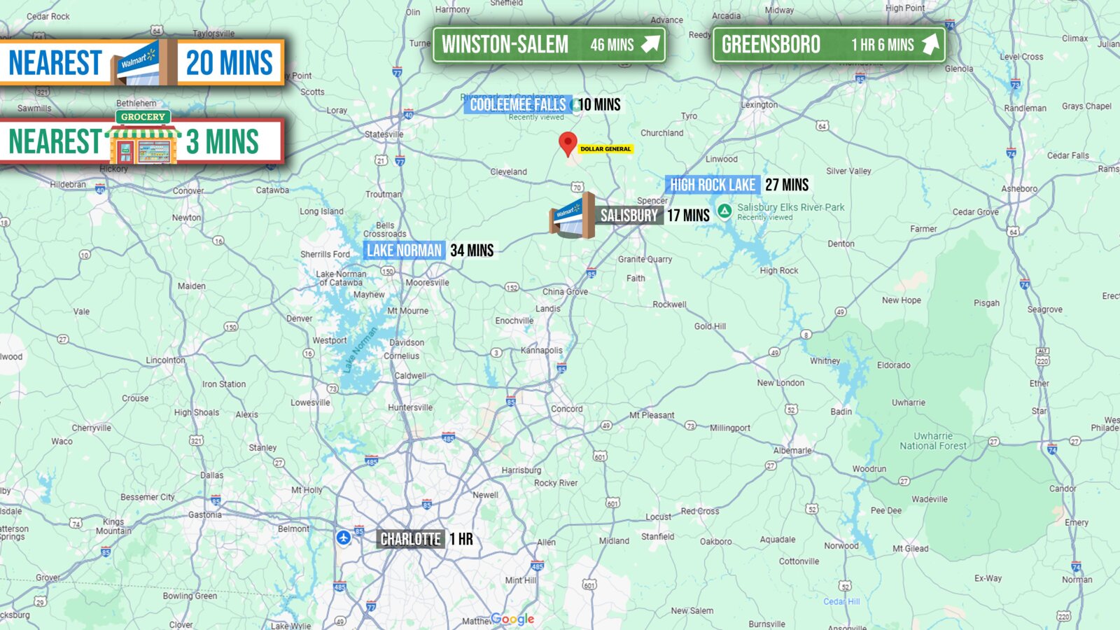 - NEAREST CITIES: Salisbury < Charlotte (S), Winston-Salem (N)