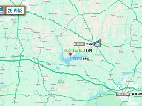The area surrounding this location offers direct access to some of Georgia’s premier water-based recreation. Seminole State Park is a primary draw for residents, offering a sandy swimming beach and easy access to one of the largest sport fishing lakes in the southeast, just 8 mins up the road! Lake Seminole is famous among professional anglers for its trophy largemouth bass and covers over 37,000 acres of freshwater, and it’s all easily accessible at the Sealy Point Landing boat ramp just 3 minutes from your driveway. For those who enjoy peaceful river exploration, the Chattahoochee River provides scenic views and boating opportunities along the Florida-Georgia border (12 mins). Residents head into the town of Bainbridge for their weekly shopping, including a Walmart and Home Depot (29 mins).