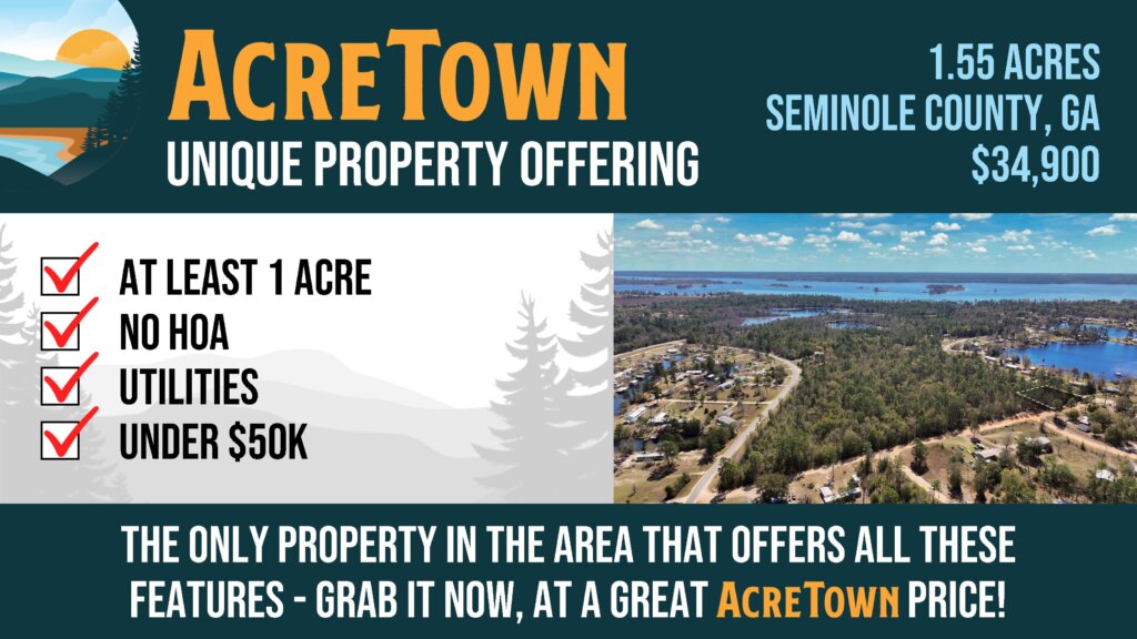 Surrounded by water, wildlife, and natural beauty, yet priced to bust the market, this is a standout value in a highly desirable recreational region. Even better, owner financing is available, making it simple to secure your own piece of lake country without the hurdles of traditional lending. Opportunities like this—buildable land, near the water, at an affordable price—don’t come along often. Come experience the setting for yourself and start planning your escape to Lake Seminole. Grab it today at an unbeatable Acretown price!