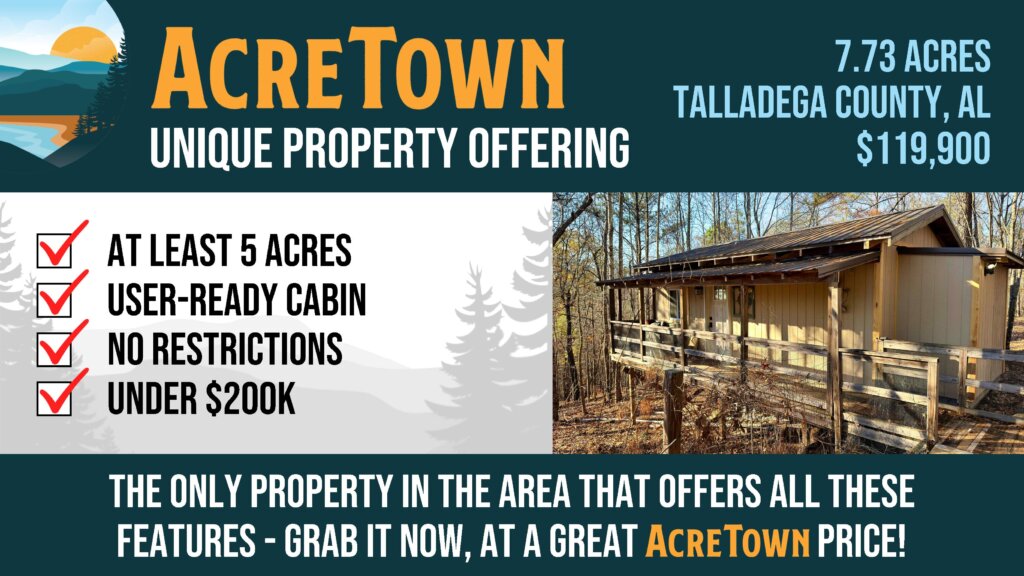 This cozy 320 sq. ft. cabin, built in 2013, sits on 7.73 acres with underground utilities – well, propane, and a 50-amp RV hookup. Surrounded by abundant wildlife, it’s the perfect hunting base camp—just bring your gear and step outsideinto the woods. Enjoy a rustic one-room living/bedroom with tongue-and-groove wood throughout, a full kitchen with stainless appliances, tiled shower,and huge walk-in pantry. Relax on the full-length covered porch after a day in the field. Convenient to Sylacauga and close to the Pinhoti Trail, this is the ideal spot for hunters, campers, or anyone looking for a getaway in the heart of Alabama’s outdoors. – Realtor Cristie Hope