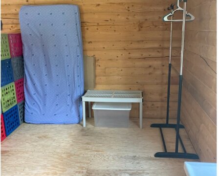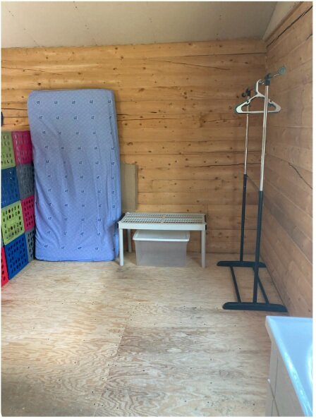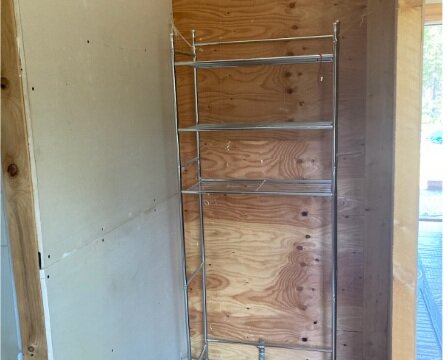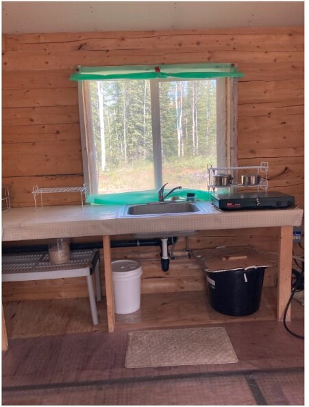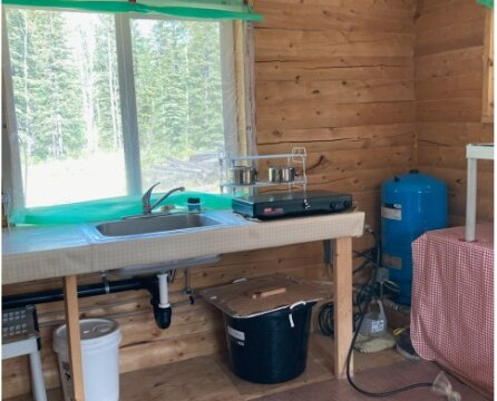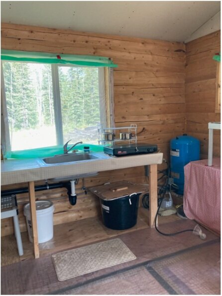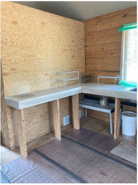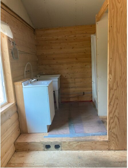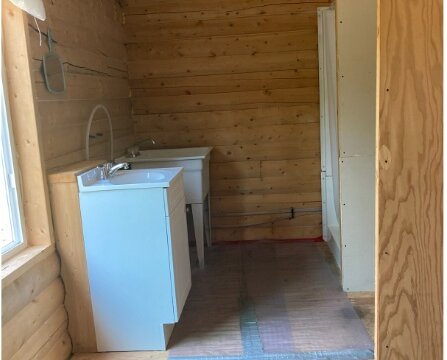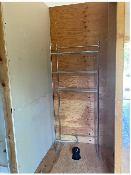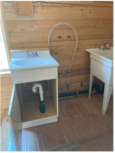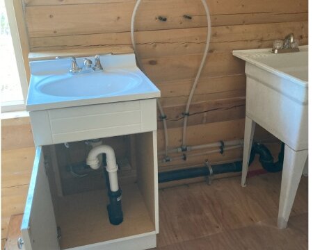 - laundry sink, vanity sink, 3′ x 3′ shower stall connected to water (will need to drill through wall to propane tank to make hot water an option)