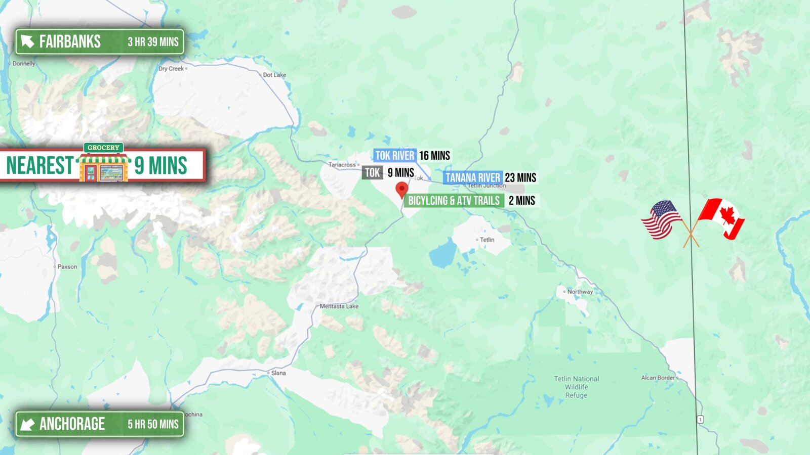 - NEAREST AIRPORTS: Tok Junction (12 mins), Fairbanks International (3 hrs 44 mins)