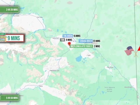 NEARBY – Rodgers Pond (6 mins), Alaskan Stoves Campground (9 mins), Mukluk Land (10 mins), Eagle Trail State Recreation Site (11 mins), Tok River State Recreation Site (13 mins), Tanana River (17 mins), Moon Lake State Recreation Site (26 mins), Tetlin National Wildlife Refuge (1 hr 48 mins), and more!